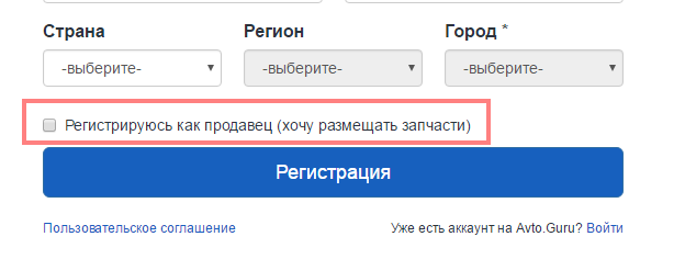 3) Проставить галочку в поле "Регистрируюсь как продавец" (хочу размещать запчасти).