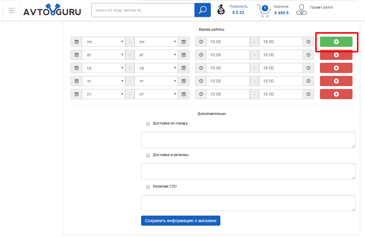При помощи кнопки "+" добавьте дни и время по которым работает Ваша компания. В случае если вы не добавите день (например Суббота и(или) Воскресенье), эти дни будут отображаться как выходные в профиле вашей компании.